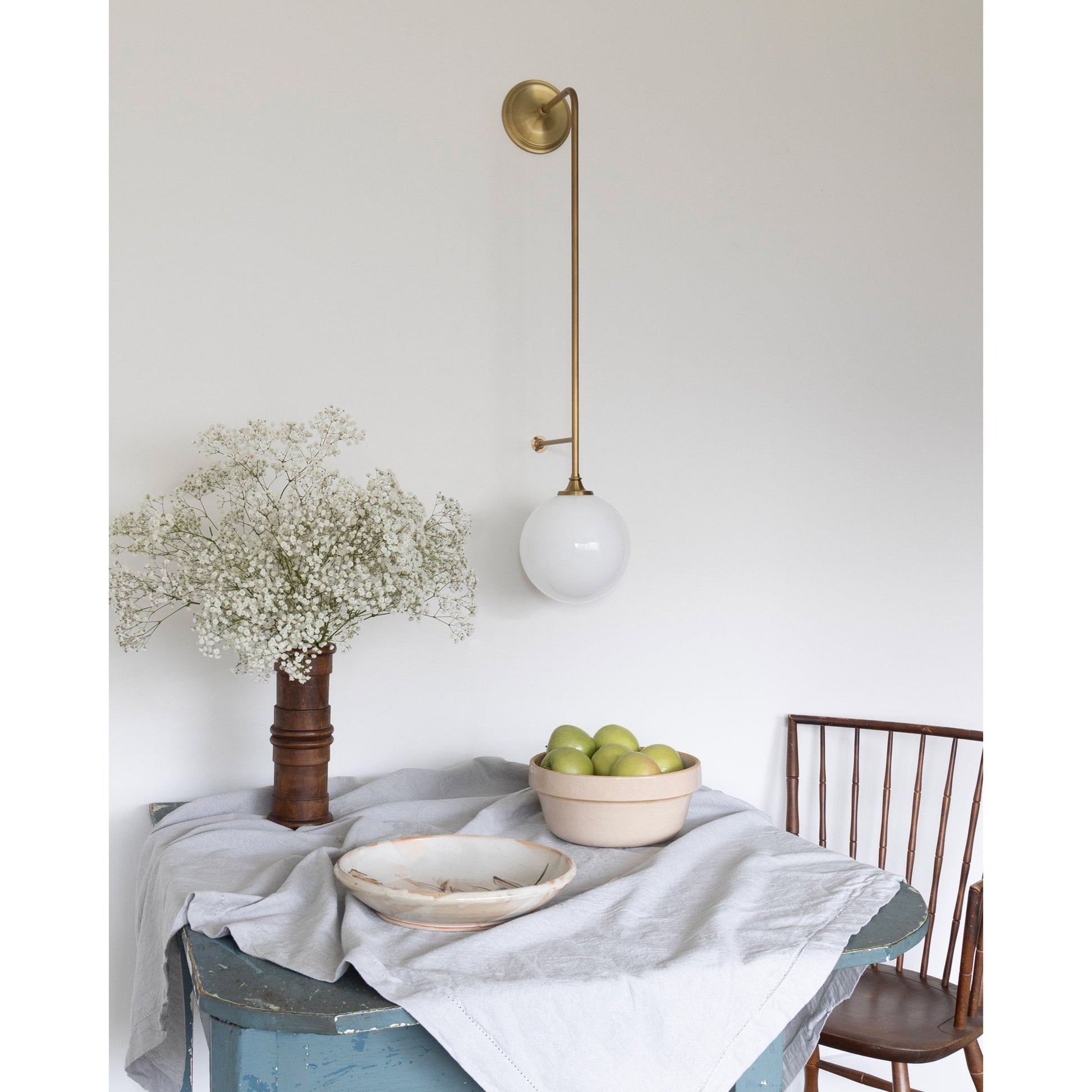 The Beverly offers a beautiful French aesthetic with statement scale. The handblown 8" opal globe can be oriented up or down and is available with two arm lengths.