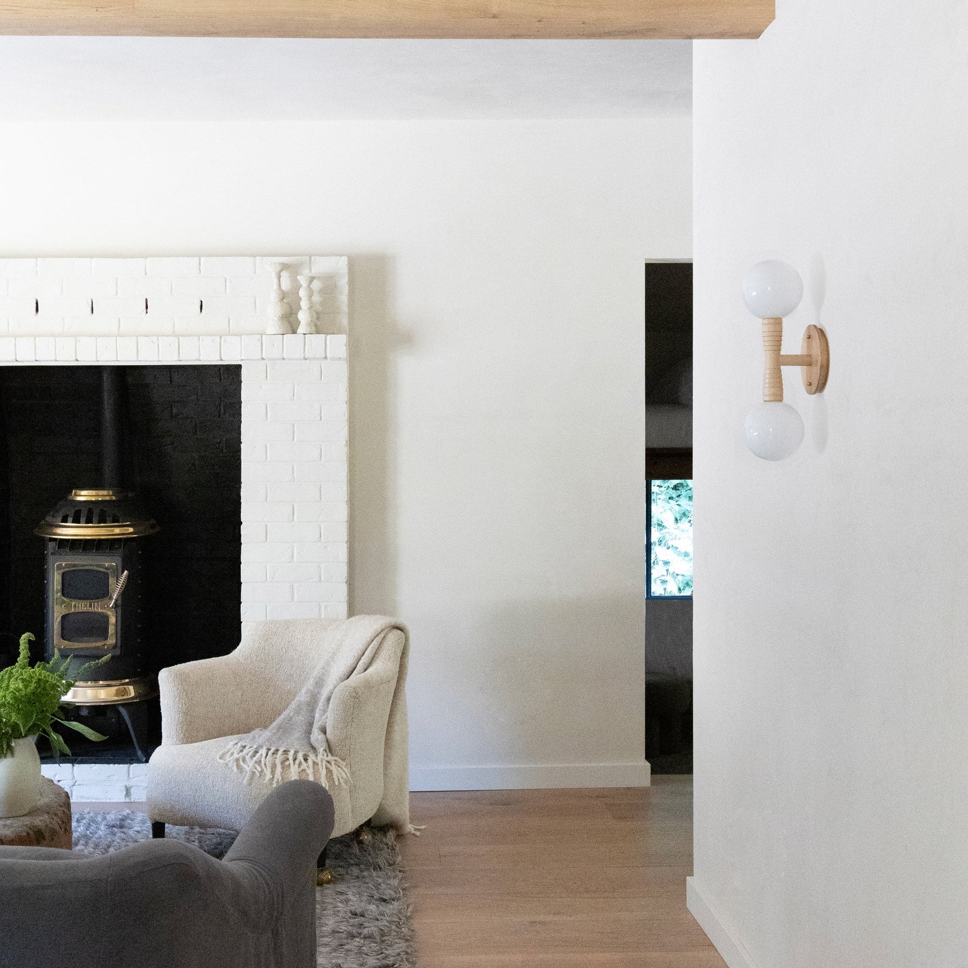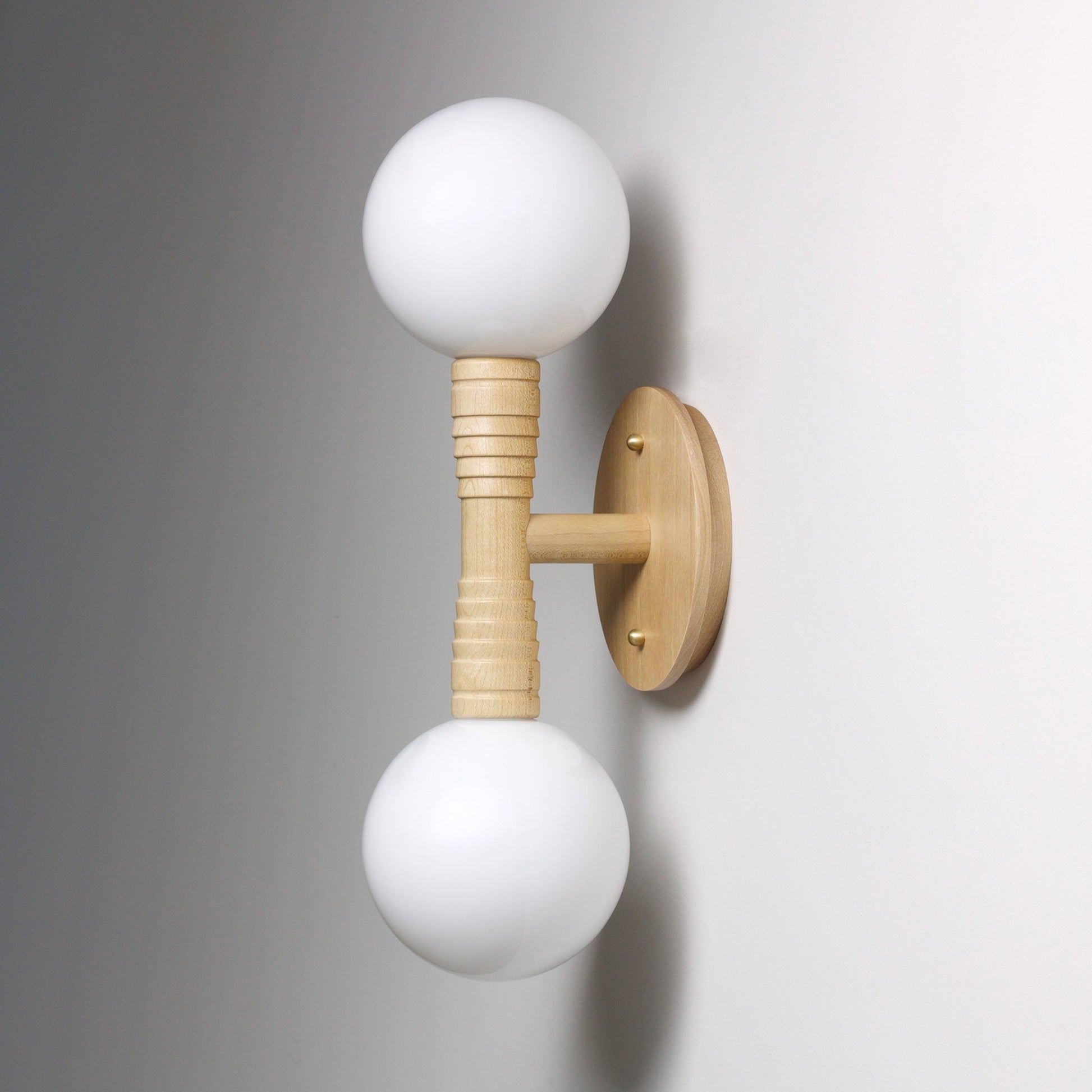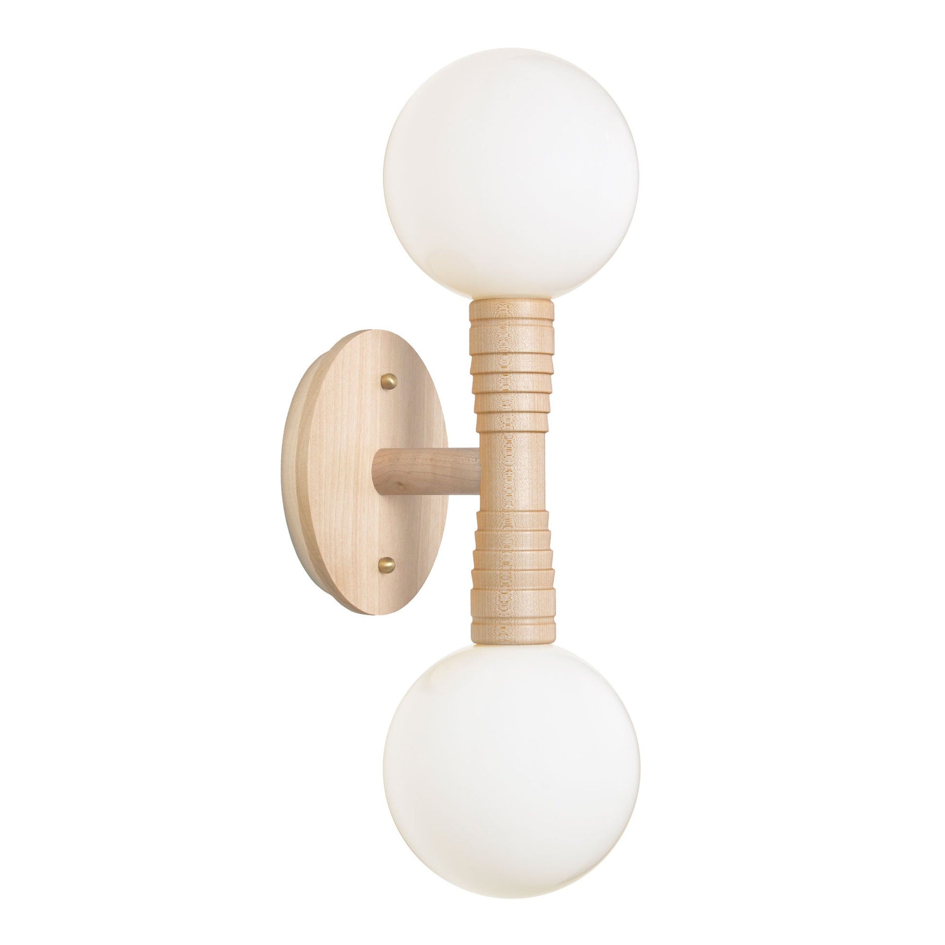 Inspired by vintage textile bobbins, our Rosie offers a sweet modern spin in maple paired with opal globes. Works beautifully orientated vertically or horizontally.